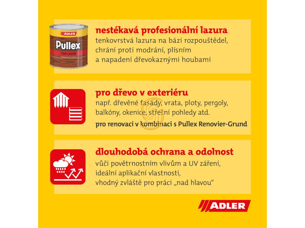 Univerzální olejová filmotvorná lesklá lazura s neodkápavací a nestékavou úpravou, která je vhodná pro nové nátěry i renovaci dřeva v exteriéru. Tato lazura na dřevo má vynikající uživatelské vlastnosti, reguluje vlhkost dřeva a je vysoce prodyšná. Dlouhodobě chrání dřevo lakovým filmem a působí preventivně proti zamodrání, plísním a houbám. Produkt je vysoce UV stabilní. Dobře se natírá, nestéká, nekape. Vyznačuje se navíc i velmi dobrou penetrační schopností a dlouhodobě chrání proti modrání, plísním a napadení dřevokaznými houbami. Je šetrná k životnímu prostredí díky vyššímu obsahu sušiny. Doporučujeme i pro nátěry svislých ploch a podbití. Ideální systémový partner pro renovaci dřeva v exteriéru je Pullex Renovier-Grund. Pro nové nátěry doporučujeme doplnit impregnací Pullex Imprägnier-Grund.